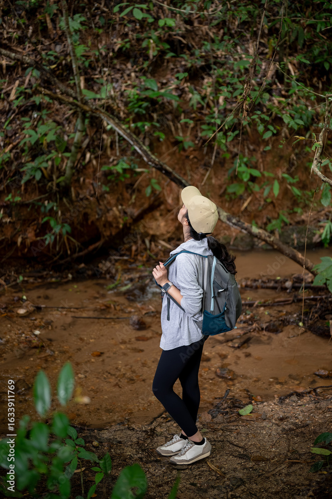 Woman tourist standing aside water stream looking up to waterfall during forest hiking or trekking.