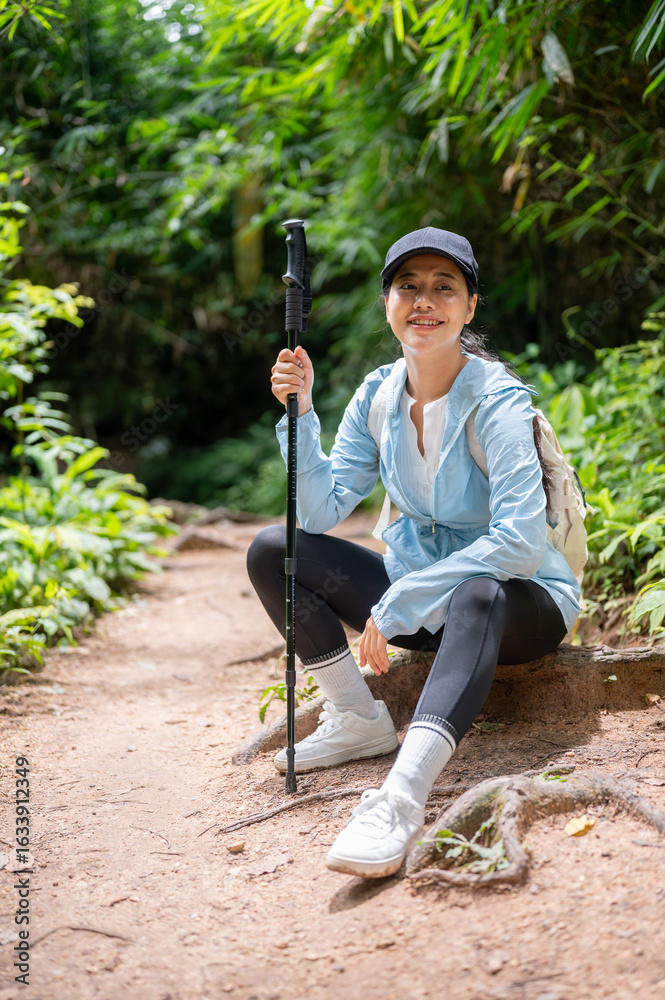 Woman backpacker with cane sitting on tree root above ground while solo hiking or trekking in forest
