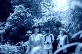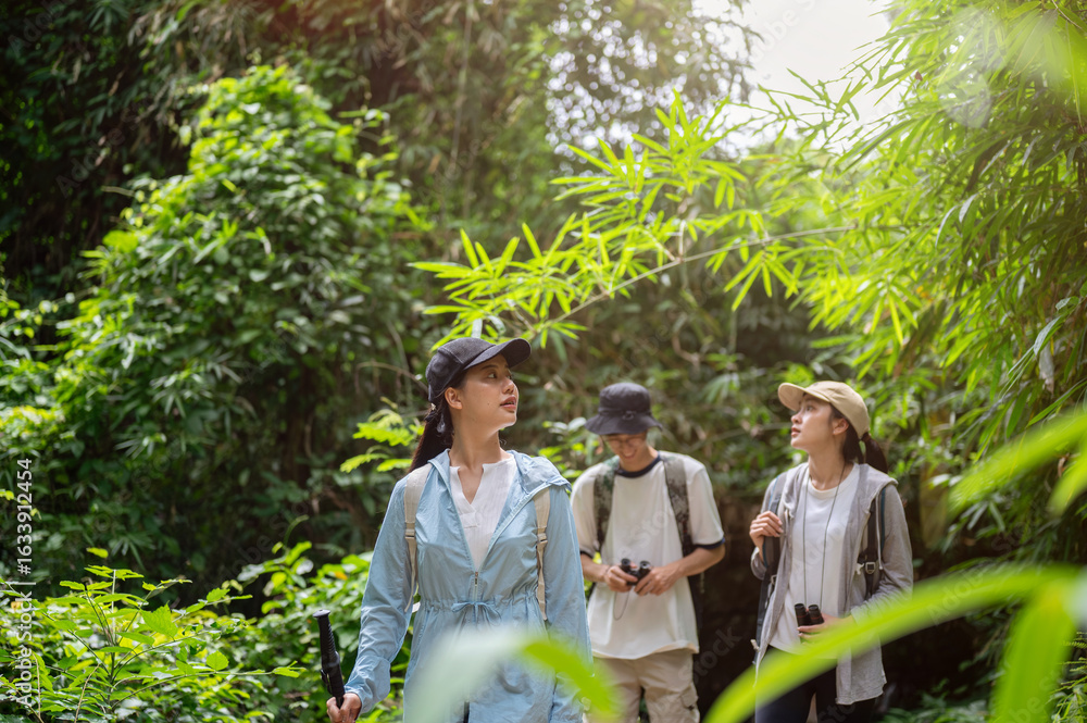 Woman tourist with a cane walking ahead leading a man and friend during forest hiking or trekking
