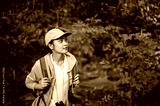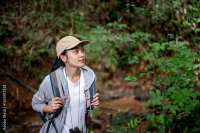 Pretty asian woman tourist holding bag straps and walking uphill during a forest hiking or trekking.