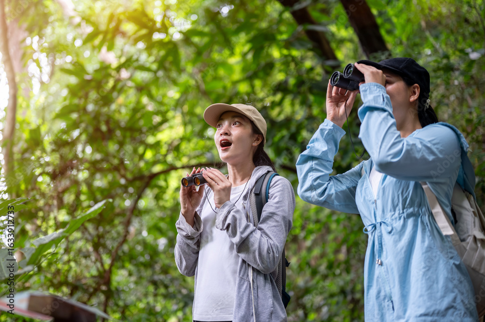 Women tourist friends group excitedly looking through binoculars during forest hiking or trekking.