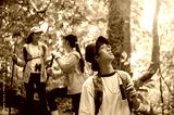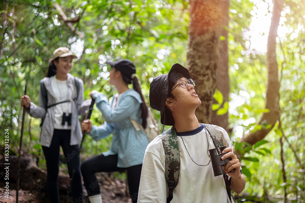 Tourist man with binocular standing looking up in front of woman friend in forest hiking or trekking