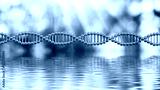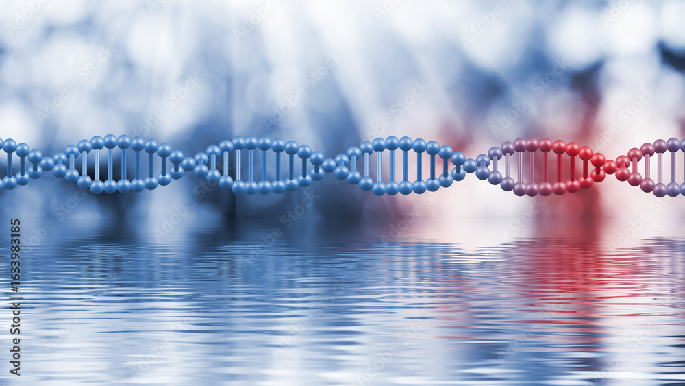 Molecular patterns emerge as water reflects a vibrant, dual-colored DNA strand glistening under soft sunlight during a serene morning