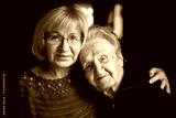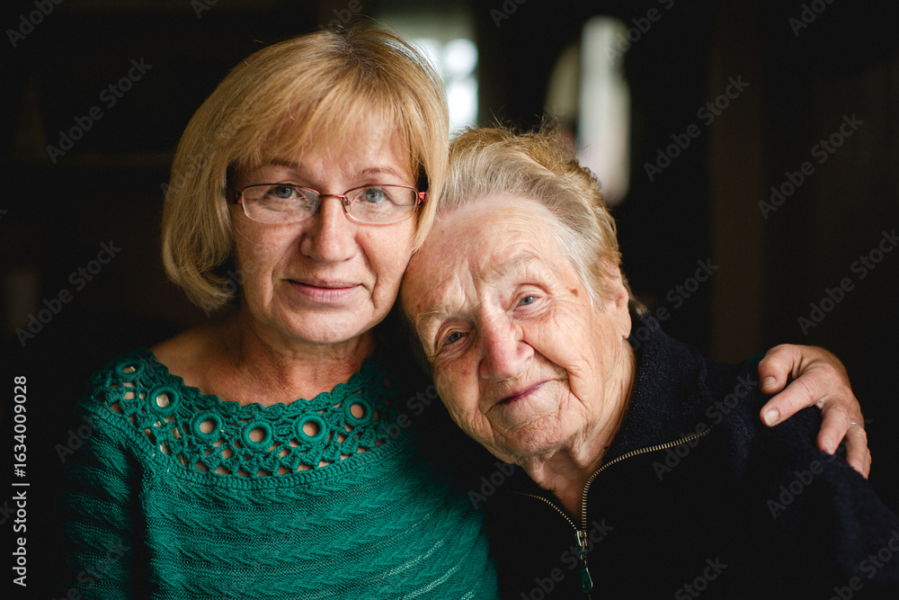 A tender portrait of an elderly woman leaning gently against her middle-aged daughter. Their closeness speaks of love, care, and an unspoken bond built over a lifetime.