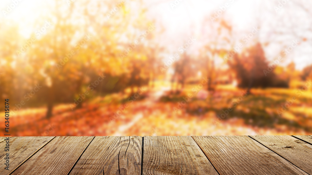 colorful fall leaves on wooden floor, autumn natural background of forest with maple trees
