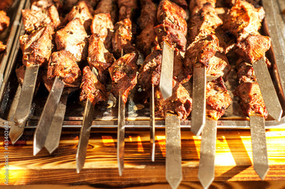 Cooked kebab strung on a skewer on a table