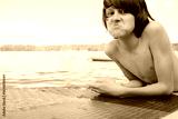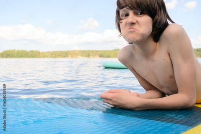Unhappy little child lying on stand-up paddleboard with disappointed expression, showing childhood emotions during water activities.