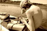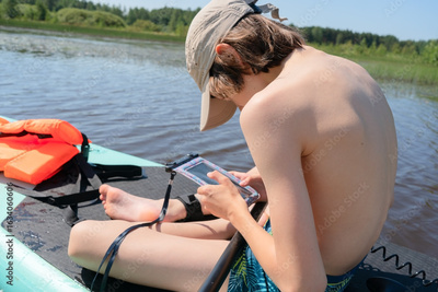 Adolescent boy sitting on paddleboard looking at phone in waterproof case, balancing modern tech with outdoor water activities.