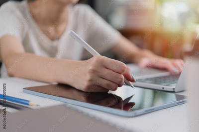 creative designer working on a graphic tablet with a stylus and laptop. business growth, innovation and technology to improve the design process and increase productivity in modern workspaces.