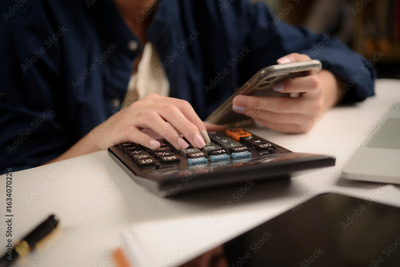 woman is calculating expenses and checking data smartphone working from home. modern financial management, business, and online shopping, perfect for advertising.