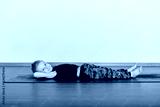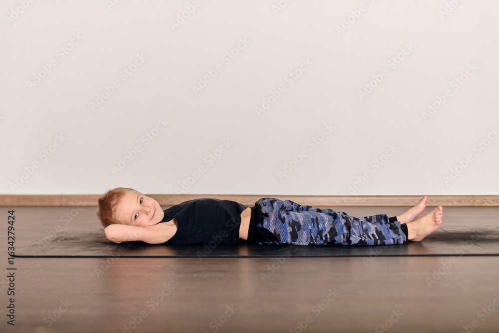 Young boy with light brown hair in relaxed lying pose on black yoga mat. Indoor studio setting with wooden floor, neutral background, and soft lighting. Calm and peaceful expression
