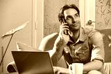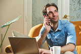 A man is sitting comfortably on a sofa, speaking on his phone with a relaxed expression. A laptop is open on the table beside him, and a coffee cup is nearby in a well-lit room