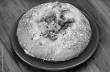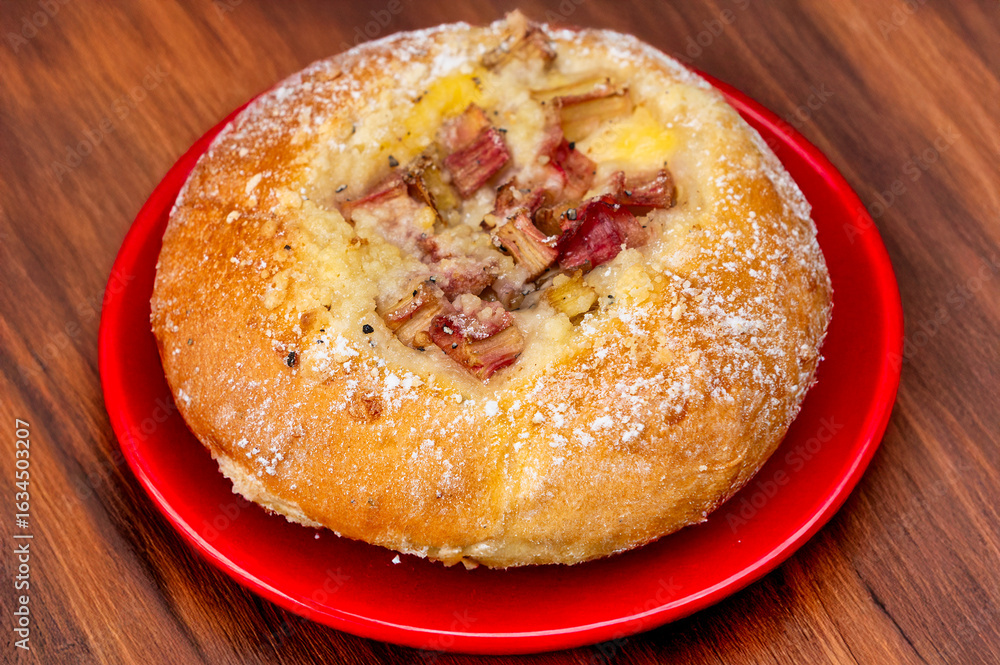 brioche topped with rhubarb crumble, featuring tender rhubarb pieces, creamy filling, and a dusting of powdered sugar. Served on a vibrant red plate with a rustic wooden background