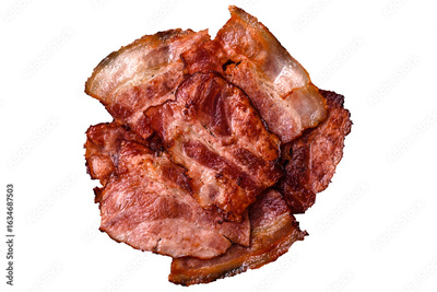 Cooked fried crispy bacon as an ingredient of a delicious English breakfast. Pieces of fried bacon