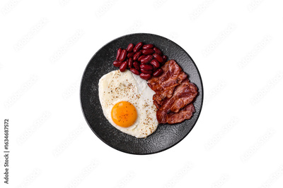 Fried egg, bacon and beans, a classic British breakfast with tomatoes. Egg, bacon and beans