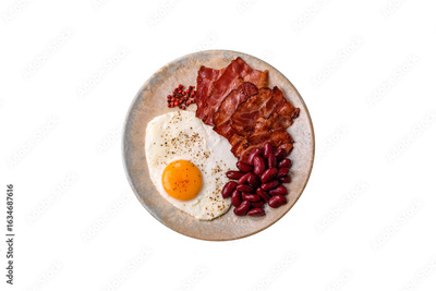 Fried egg, bacon and beans, a classic British breakfast with tomatoes. Egg, bacon and beans