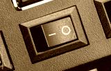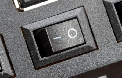 Macro closeup of a black rocker power switch in off position on a generic electronic device appliance circle and line symbols on textured plastic two way control switch, hardware button detail closeup