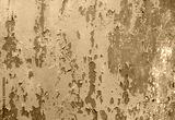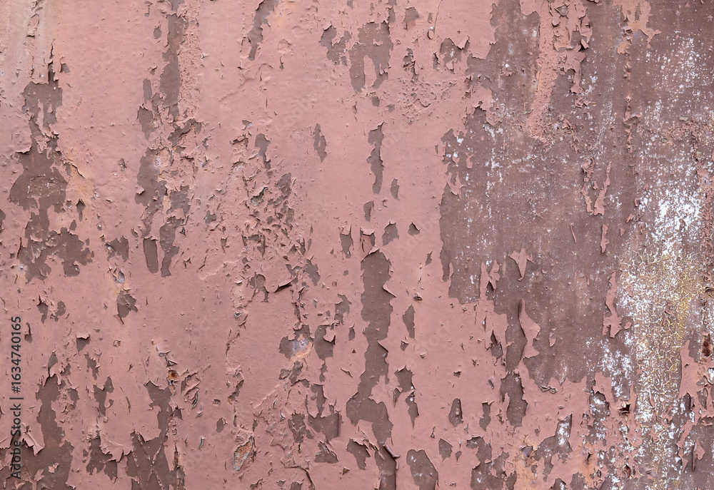 Rusty metal wall with peeling paint and corrosion, bright flaking surface grunge texture background, old industrial panel gate wall closeup showing decay, weathered steel abstract backdrop, no people