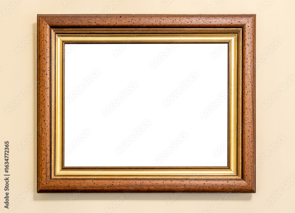 Horizontal wooden picture frame with gold trim hanging on a cream wall, blank white cut out inside space for artwork photo or painting, classic decorative border mockup template front view wall shadow