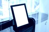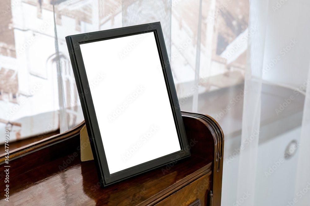 Simple black tabletop picture frame with a stand placed on a wooden shelf at home, blank white space inside mockup template for person portrait photo, simple home interior decor element, no people