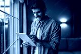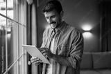 Happy man using digital tablet by window at home.