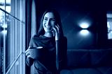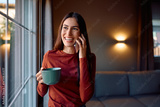 Happy woman talking on cell phone while drinking coffee by window at home.