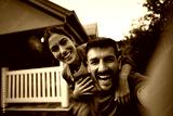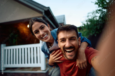 Cheerful couple taking selfie in front of their new house and looking at camera.