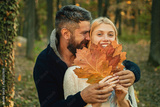 Happy couple in love Enjoying Romantic Nature Autumn Fall. Couple in Autumn fall park. Man and woman near Autumn fall leaves.