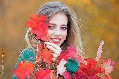 Autumn portrait of happy young woman. Smiling woman on autumn fall background. Beauty girl with fall leaves. Autumn model with fall maple leaf. Autumn portrait of beautiful happy girl.