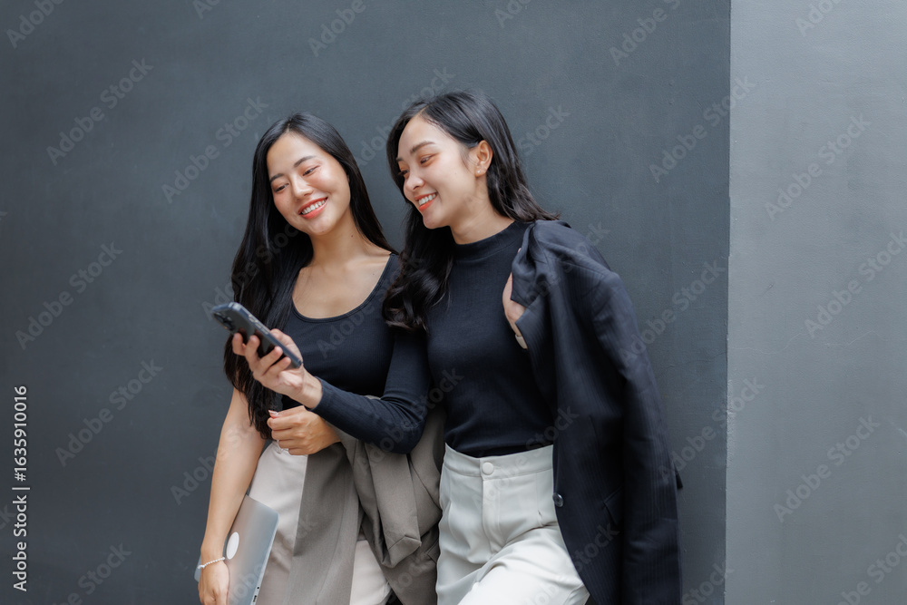 Two young businesswomen sharing a smartphone and smiling against gray wall
