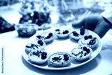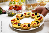 Hand holding a plate of eight tartlets topped with blueberries and red sprinkles, with a festive buffet spread in the background