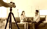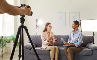 African journalist woman holding microphone, interviewing female seated on sofa, camera mounted on tripod recording interaction for channel, media production, online content creation for platform