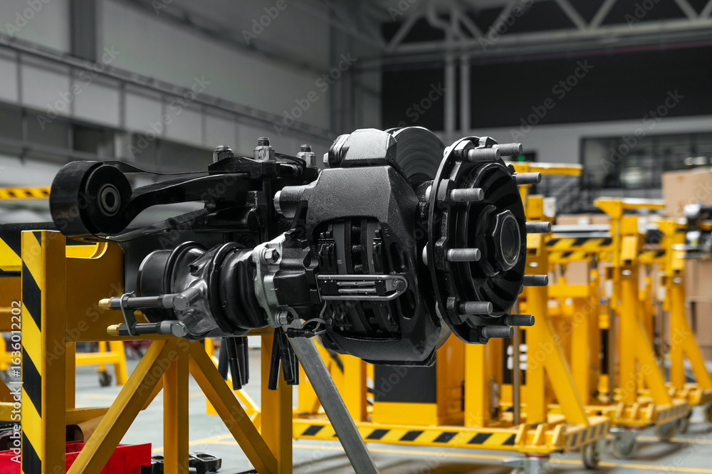 Heavy-Duty Trailer Axle on Assembly Stand in Industrial Workshop