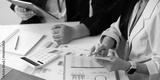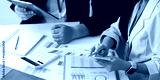 Data Analysis. Professionals reviewing financial documents and charts in a collaborative workspace.
