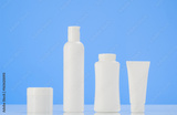 Set of tubes and containers of cream or gel in white plastic packaging. Product mockup with mirror reflection on white table with blue background.