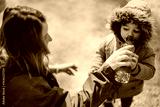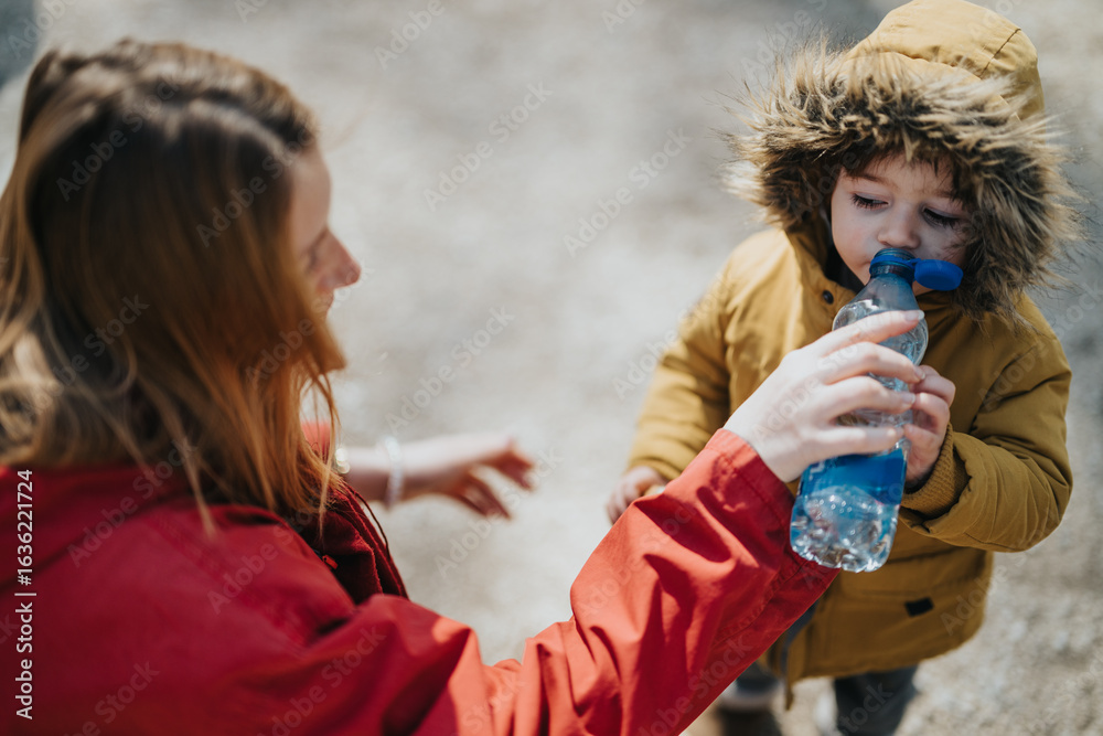A young woman helps a toddler, dressed warmly in a jacket, drink water from a bottle. The scene is outdoors in bright sunlight, showcasing care, hydration, and parental love.
