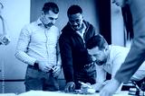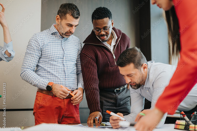 Group of diverse professionals engaged in productive teamwork during a business meeting, collaborating on creative ideas and strategies in a modern corporate office setting.