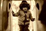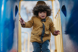 Child wearing a winter coat with fur hood playing inside a colorful playground tunnel, showcasing a joyful outdoor activity in a vibrant and engaging setting.