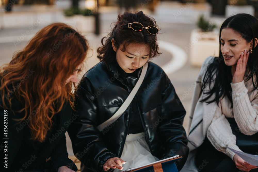 Three friends are gathered outside on a sunny day, collaborating and brainstorming ideas using a digital tablet, showcasing teamwork and interactive outdoor meetings.
