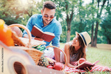 Picnic time. Young couple enjoying picnic in the park. Lifestyle, love, relationships concept