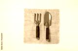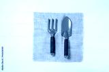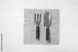 Gardening tools top view on white wooden planks background with copy space around products. Border with place for text. Gardening or planting concept seen from above. Working in a clean indoor garden.