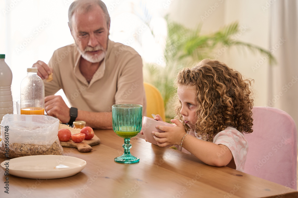 Grandfather and granddaughter eating breakfast at home