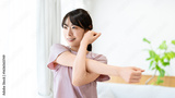 自宅のリビングでストレッチをする女性