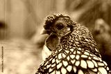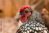 This is a closeup image showcasing a beautifully feathered chicken in its natural farm setting, surrounded by elements of agriculture and rural life that highlight the beauty of avian wildlife