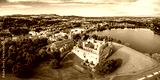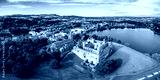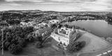 The skyline of Linlithgow including the ruins of Linlithgow Palace and St. Michael's church from the air. Linlithgow, West Lothian, Scotland.