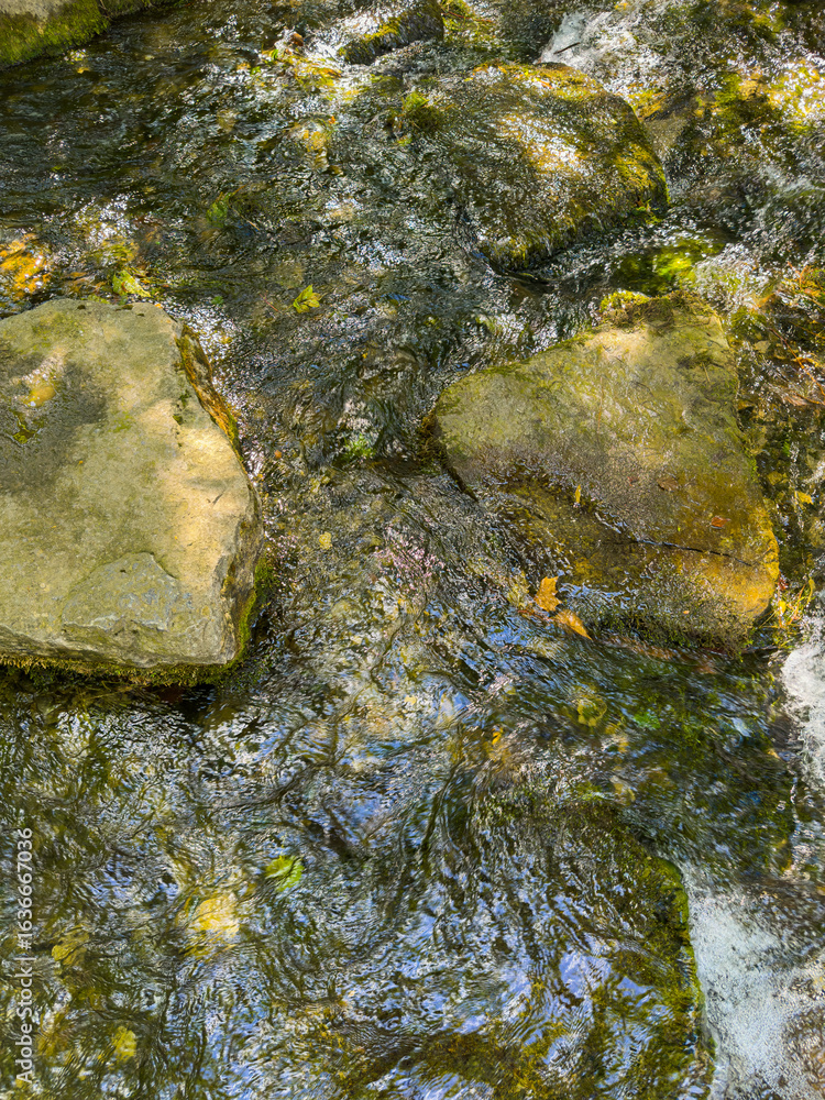 In a tranquil natural setting, a clear stream flows gently over smooth stones, showcasing the unparalleled beauty and breathtaking scenery of the untouched wilderness that surrounds it on all sides