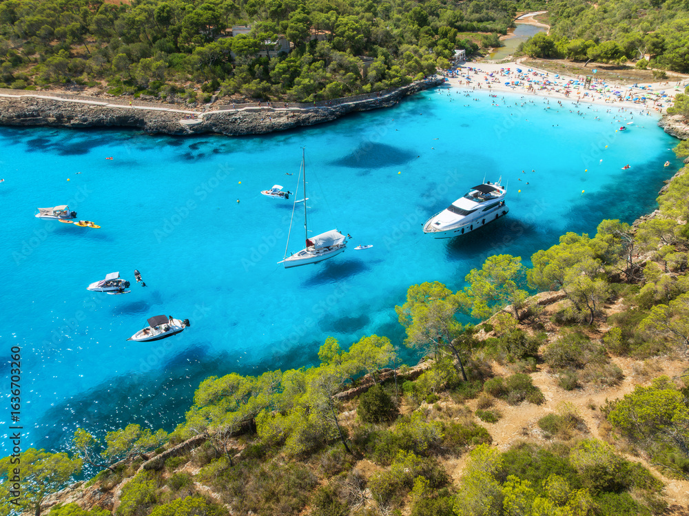 Aerial top view from drone of yachts and boats anchored in turquoise sea bay surrounded by rocky coastline and pine forest, summer vacation scene near Cala Mondrago, Mallorca, Balearic Islands, Spain