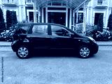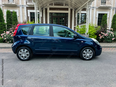 A sleek blue compact car is parked in a vibrant urban environment, featuring elegant architecture and greenery. This scene blends automotive design with lifestyle, perfect for summer travel