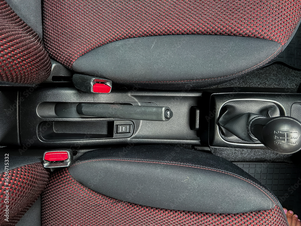 The cars central console highlights various components, showcasing the carefully chosen materials for the seats and gear shift design, focusing on both functionality and aesthetics