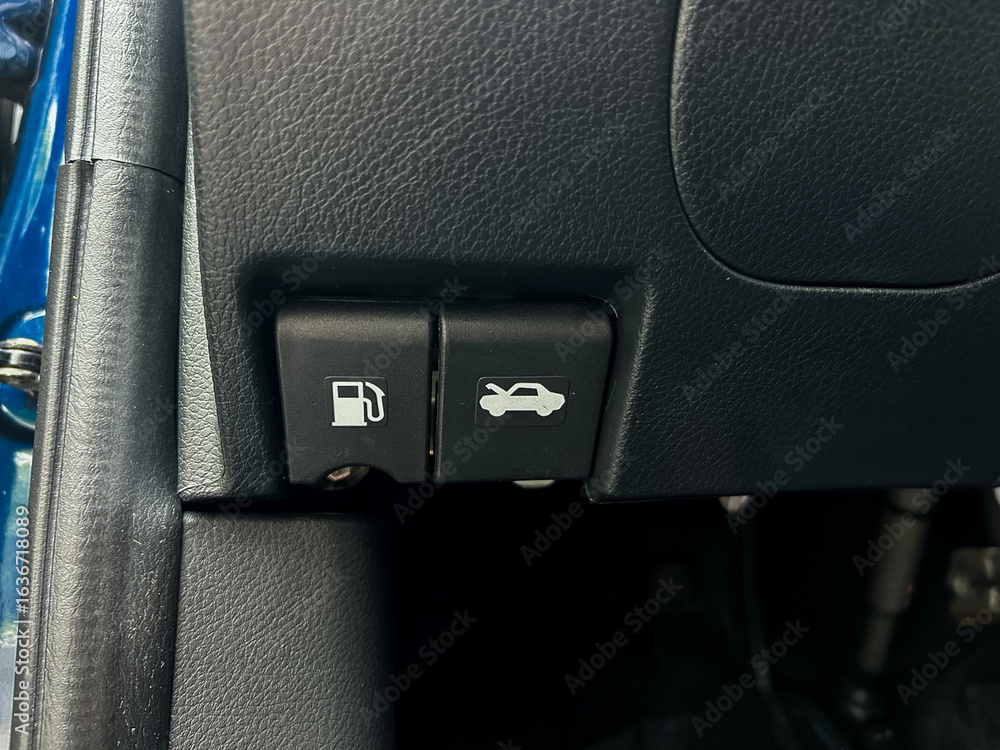 A detailed closeup view showcasing the interior switches of a car, specifically designed for the fuel and trunk release functions, highlighting their accessibility and importance in transportation